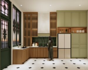 Mengusung gaya Mid-Century Modern, karya Timeless Precision terinspirasi dari era 1940-1960-an yang menekankan craftsmanship, garis bersih, dan fungsi yang bermakna. Dominasi warna sage green dan corak kayu menciptakan suasana yang hangat dan elegan. Sementara integrasi produk BLANCO menghadirkan sistem dapur yang presisi, ergonomis, dan harmonis.