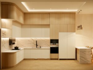 Secara visual, desain dapur mengaplikasikan finishing kayu oak alami dan warna ivory sebagai elemen utama yang membangun suasana hangat dan tenang khas Skandinavia. Perancangan ini ditujukan bagi keluarga dengan intensitas penggunaan dapur yang tinggi, sehingga layout disusun secara luas dan efisien. Penggunaan peralatan tanam (built-in) turut membantu menjaga sirkulasi kerja tetap lancar, sekaligus menciptakan tampilan ruang yang rapi dan selaras.