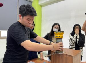 Kegiatan dilanjutkan dengan workshop pembuatan side table, di mana mahasiswa diajak untuk langsung mengaplikasikan material yang telah diperkenalkan. Dalam proses ini, mahasiswa tidak hanya belajar teknik dasar pembuatan furniture, tetapi juga mengasah kemampuan eksplorasi desain, ketelitian, serta pemahaman konstruksi secara praktis.